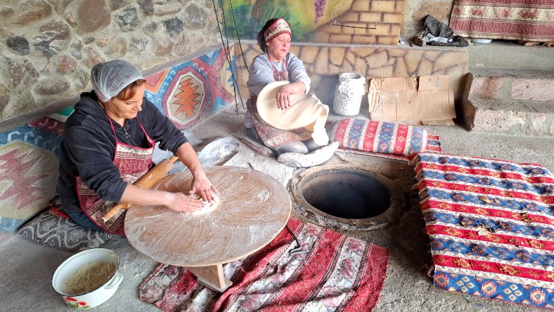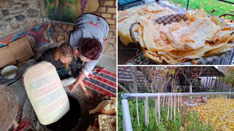 Jeg får prøve meg på Lavash-baking. På bildet nede til høyre henger hjemmelaget ost til tørk.