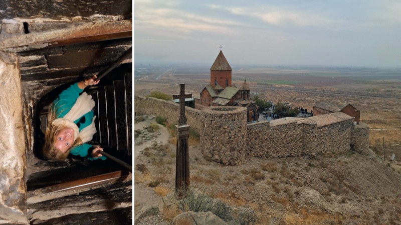 Man kan klatre ned en tunnel til grotten hvor St. Gregor Lysbringeren satt fenglset i Khor Virap.