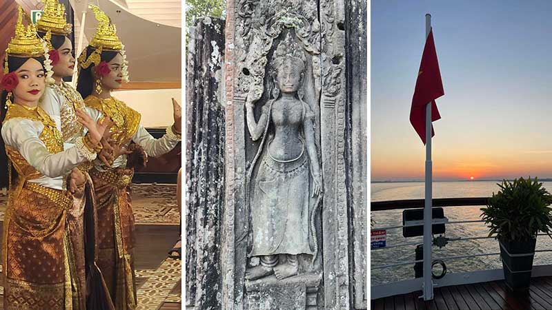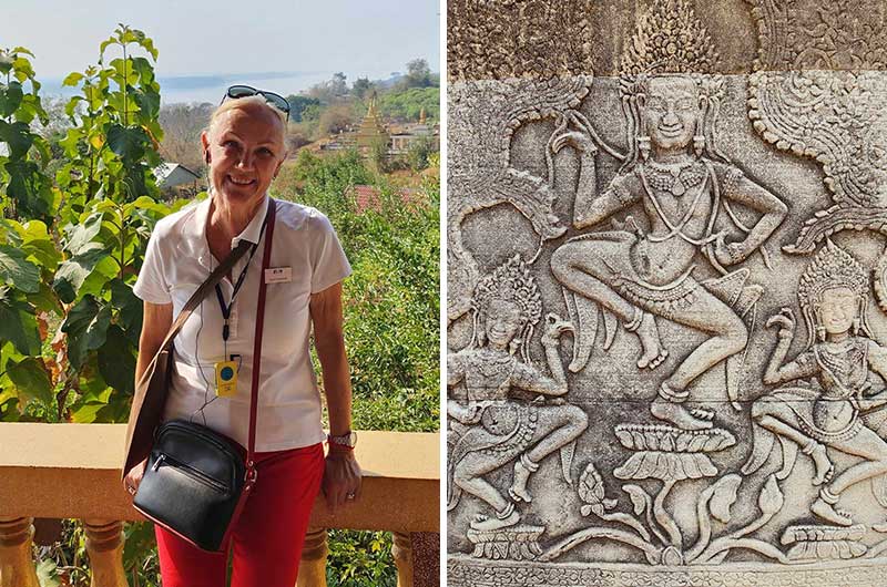 En av kveldene om bord på skipet underholdes vi med apsaradans – en klassisk dans opprinnelig reservert for kongelige. Dansen ble utført på seremonier og festivaler. Kongene hadde hundrevis av apsaraer på hoffet, som kunne underholde kongen hele natten. Kong Jayavarman VII hadde tre tusen apsaradansere ved sitt hoff! Utskjæringen av en apsaradanser i midten er fra Angkor.