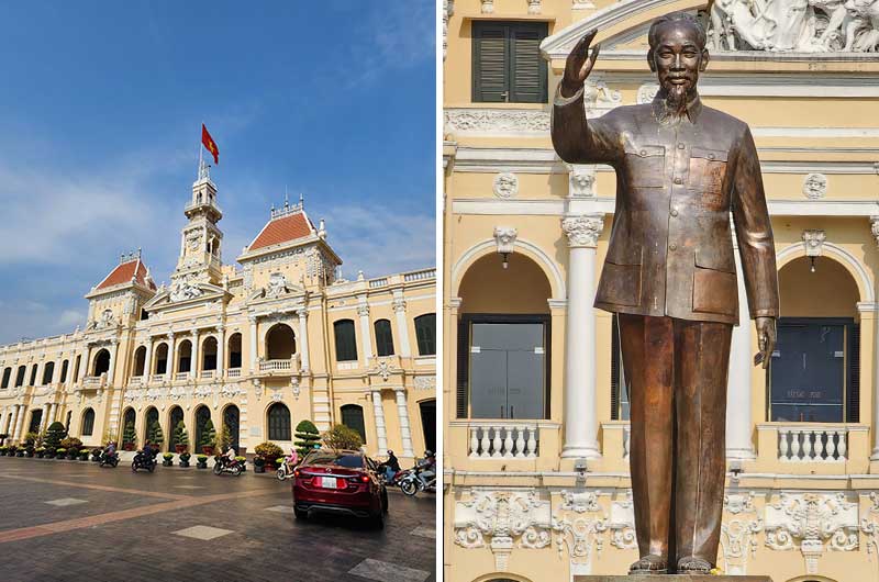 Rådhuset i Saigon i fransk nyrenessanse-stil med statuen av Ho Chi Minh i forgrunnen.