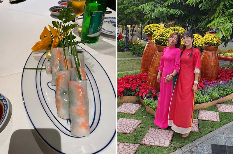 Det vietnamesiske kjøkkenet er blant annet kjent for gode supper og ferske vårrullerer. Og maten blir alltid lekkert dandert ved servering. Jentene til høyre har på seg den vietnamesisk «folkedrakten» Ao Dai. Har du lyst på din egen drakt, kan reiselederen ordne med bestilling som blir levert på hotellet i HCMC før avreise.