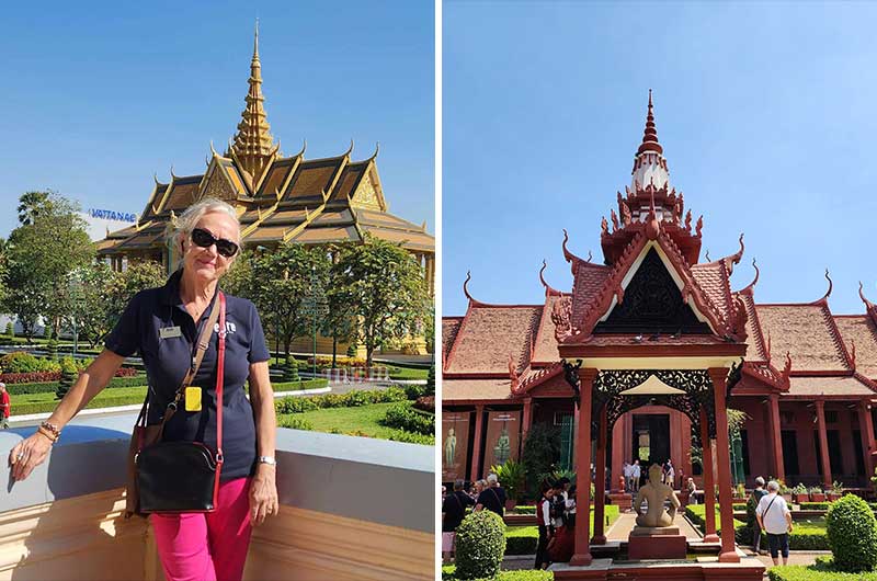 Reiseleder Gerd foran Sølvpagoden. Til høyre inngangspartiet til Nasjonalmuseet