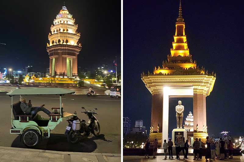 Uavhengighetsmonumentet (til venstre) og monumentet og statuen av kong Sihanouk (til høyre).