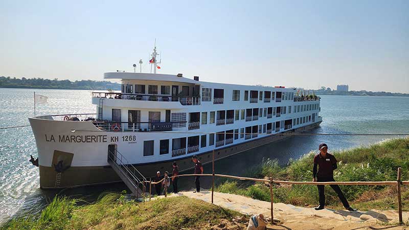 Om ettermiddagen kommer vi til grensen mot Kambodsja. Etter visumformalitetene seiler skipet videre oppover den brede Mekongelven med kurs for Phnom Penh, hovedstaden i Kambodsja.