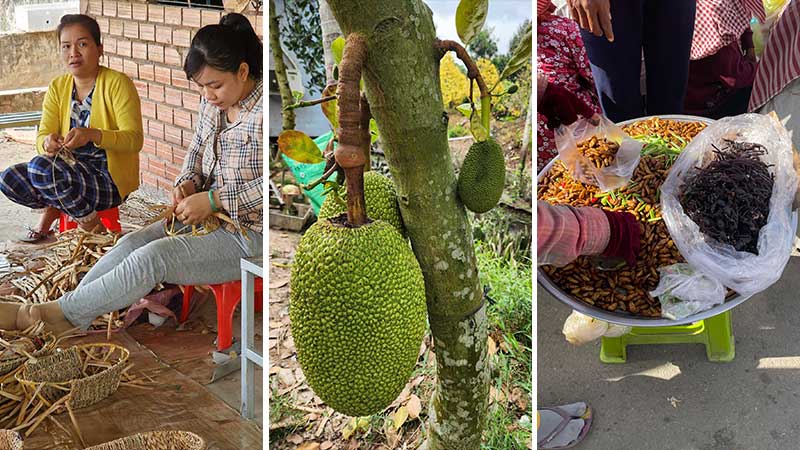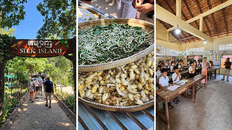 Tidlig om morgenen seiler vi til Silkeøyen, like nord for Phnom Penh. Fra skipet spaserer vi til den lille landsbyen hvor de produserer og vever silke.