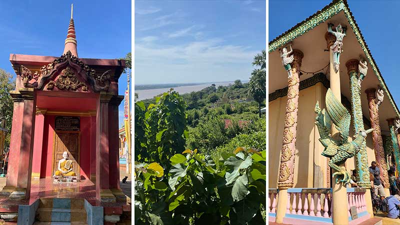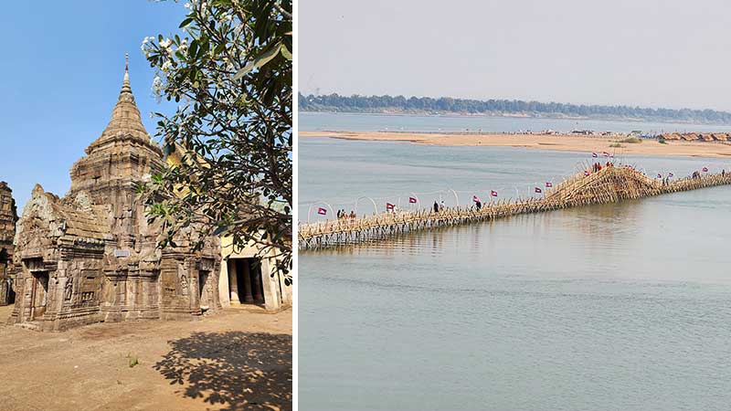 Wat Nokor nær Kampong Cham (til venstre). Bambusbroen mellom Koh Paen og Kampong Cham (til høyre)