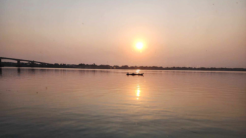 Vår siste soloppgang over Mekong. En familie er allered på elven for å fiske