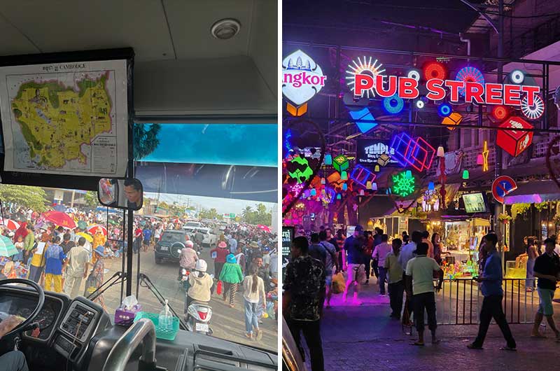 Fargerikt folkeliv utenfor bussvinduet (til venstre). Berømte Pub Street i Siem Reap, med mange restauranter, barer, kafeer, butikker og markeder (til høyre).