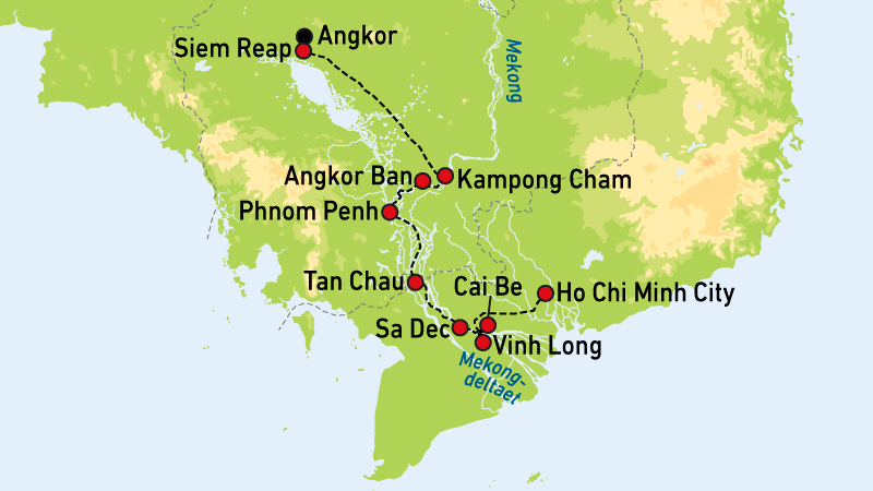 Bli med på et opplevelsesrikt cruise på mektige Mekong gjennom Kambodsja og Vietnam. Vi starter reisen i Siem Reap, som er vår base for å utforske de fantastiske tempelruinene i Angkor, den tidligere hovedstaden i Khmerriket. Deretter seiler vi med det førsteklasses skipet RV La Marguerite på Mekong fra Kambodsja til Vietnam. Underveis blir det besøk i vakre templer, Kambodsjas hovedstad Phnom Penh og små byer i det enorme Mekongdeltaet. Fra soldekket har vi orkesterplass til det yrende livet på elven og langs elvebredden. De siste dagene tilbringer vi i Ho Chi Minh City, Vietnams største by.