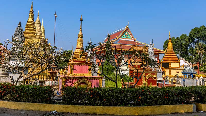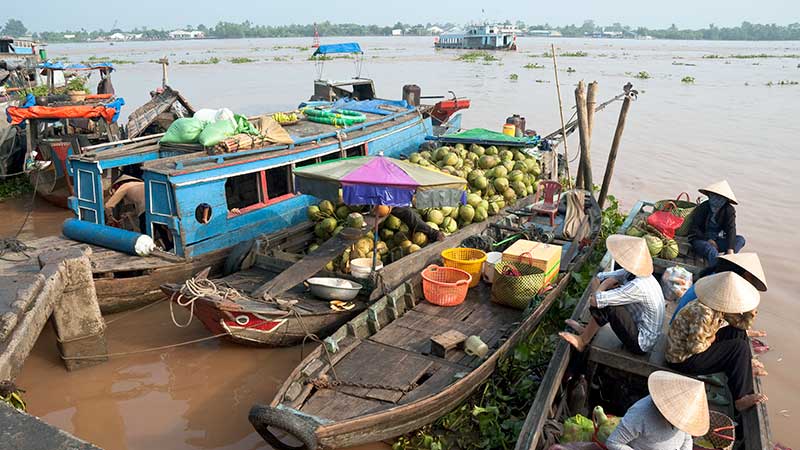 Om morgenen drar vi på utflukt med mindre båter til Ben Tre-distriktet hvor vi ser det flytende kokosnøttmarkedet og besøker Vinh Buu-pagodaen.