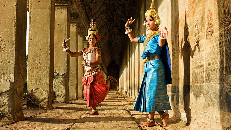 Om kvelden underholdes vi av tradisjonelle khmer-dansere i skipets salong.