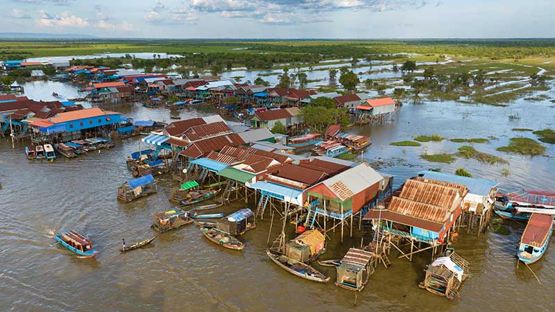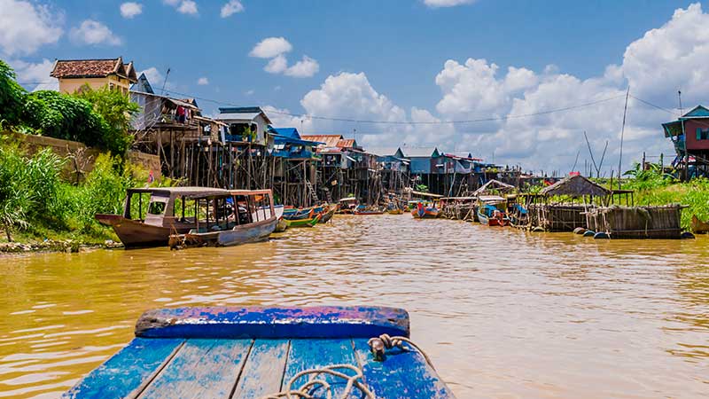 Om morgenen blir vi hentet av en buss som kjører oss gjennom små landsbyer og forbi rismarker mot den store innsjøen Tonle Sap. Her skal vi besøk Kampong Phluk, en av de mange flytende landsbyene ved innsjøen. Vel fremme går vi om bord i en motorbåt og kjører gjennom mangroveskogen på vei ut til landsbyen. Vi ser hus på stylter, skoler og det flytende markedet, samt får et inntrykk av hverdagslivet til de som bor ved innsjøen.