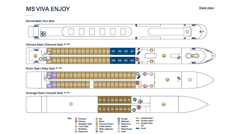 Viva Enjoy har totalt 95 lugarer. Alle er utvendige og har to senger satt sammen til en dobbeltseng, bad med dusj, hårtørrer, skjønnhetsprodukter fra Rituals, flatskjerm-TV, safe, minibar, Nespresso kaffemaskin og aircondition. Lugarene på Diamond (øvre dekk) og Ruby dekk (midtdekk) har fransk balkong, mens lugarene på Emerald dekk (hoveddekk) har ett langt smalt vindu høyt på veggen som ikke kan åpnes. Standardlugarene er 15 m². I tillegg er det åtte suiter på Diamond dekk (24 m²) med fransk balkong.