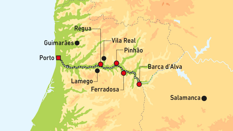 Fra sitt utspring i Nord-Spania renner Douro vestover og videre inn i Portugal. Her bukter elven seg gjennom den frodige Dourodalen før den munner ut i Atlanterhavet ved Porto. Cruiset starter og ender i Porto og går helt til grensen mot Spania. Fra skipet nyter vi utsikten til det velpleide kulturlandskapet med terrasserte vinmarker. Det er mulig å kjøpe utflukt til blant annet Guimaraes –kalt Portugals vugge, Solar de Mateus-palasset, pilegrimskirken Lamego og den spanske middelalderbyen Salamanca.