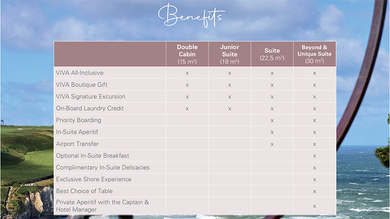 VIVA Beyond er det første skipet i VIVA cruises nyeste konsept; VIVA Boutique. Om bord på VIVA Beyond er amosfæren litt mer eksklusiv enn på de andre skipene til VIVA og halvparten av alle lugarene er suiter. Én signaturutflukt inkludert for alle.