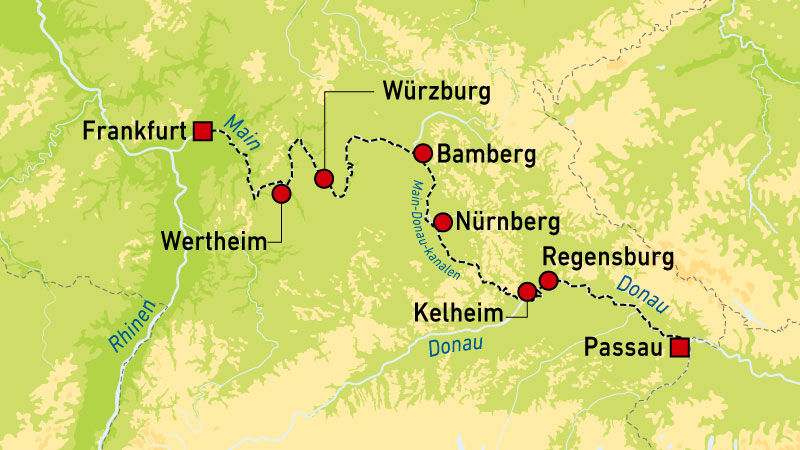 Bayern er selve symbolet på tysk historie og kultur, med pittoreske landsbyer fra middelalderen, bindingsverkshus og romantiske slott. Vår reise starter i Frankfurt ved Main og ender i Passau ved Donau. Mellom de to elvene seiler vi på Main-Donau-kanalen, regnet som et mesterverk innen moderne ingeniørkunst. Da kanalen åpnet i 1992 ble det for første gang mulig å seile hele veien fra Nordsjøen til Svartehavet. Flere av stedene vi besøker i løpet av cruiset står på UNESCOs verdensarvliste. Mens skipet seiler fra den ene sjarmerende byen til den andre, nyter vi det gode livet om bord på det førsteklasses skipet Viva Tiara, og tar innover oss regionens joviale atmosfære, preget av tysk Gemütlichkeit (hygge).