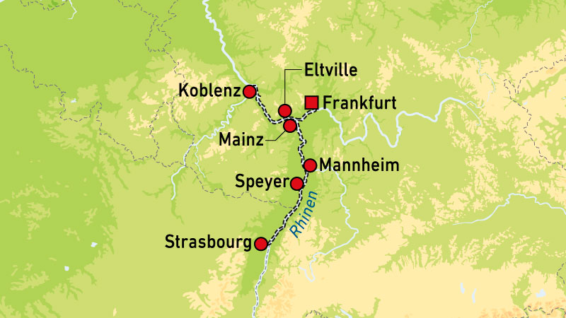Avslutt 2024 med et behagelig cruise på romantiske Rhinen med det førsteklasses skipet VIVA Tiara. Cruiset starter og ender i Frankfurt. Derfra seiler vi oppover elven til Mannheim, Strasbourg og Speyer. Deretter går ferden nordover til den UNESCO-vernede Øvre mellomrhindalen. Nyttårsaften feirer vi i Koblenz, før vi avslutter cruiset med besøk i Eltville og Mainz. Om bord på VIVA Tiara er både utsøkte måltider, alle drikkevarer og tips inkludert. Ønsk det nye året velkommen, og si «Frohes neues Jahr» sammen med oss!