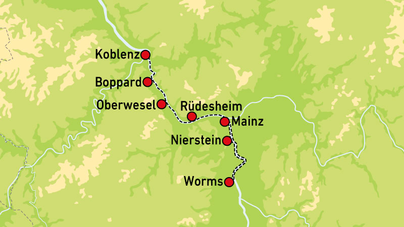 Sykkelcruiset langs Rhinen går gjennom de vakreste vinområdene langs elven. Vi starter i Koblenz, der Mosel munner ut i Rhinen. Derfra sykler vi på gode sykkelveier gjennom den UNESCO-vernede og naturskjønne Øvre mellomrhindalen, forbi bratte vinmarker, små pittoreske landsbyer og borger fra middelalderen. Med korte sykkeletapper er dette en tur som er spesielt godt egnet for de som setter pris på å kunne ta flere pauser underveis og oppleve mer av byene vi besøker. På sykkelturene trår du i ditt eget tempo, mens skipet følger etter og venter på oss i neste havn. Mange av byene vi passerer er kjent for sin vinproduksjon, og en pause på en lokal weinstube er en del av opplevelsen. Et sykkelcruise på Rhinen er en utmerket kombinasjon av aktivitet og avslapping.