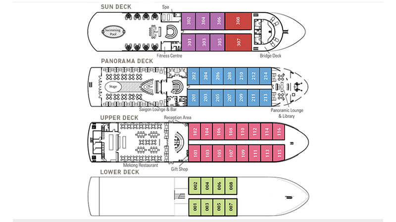 Skipet har totalt 46 lugarer. Alle er utvendige og har skrivebord, minibar, safe, hårtørrer og aircondition. Lugarene på Upper Deck og Panorama Deck er på 20 m² og har bad med dusj, stort vindu og privat balkong. Det er to senger som kan settes sammen til en dobbeltseng. På Sun Deck er det seks juniorsuiter (26 m²) og to deluxe suiter (41 m²). Alle suitene har stor dobbeltseng, en liten sofa, privat balkong og bad med dusj og separat jaccuzzi-badekar.