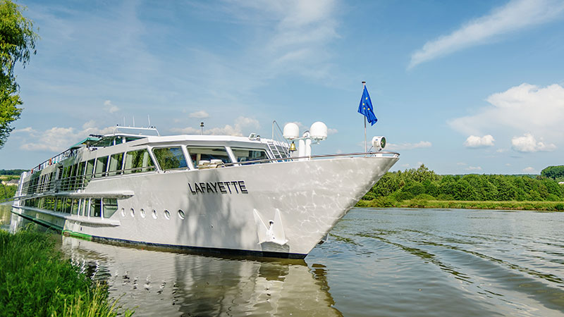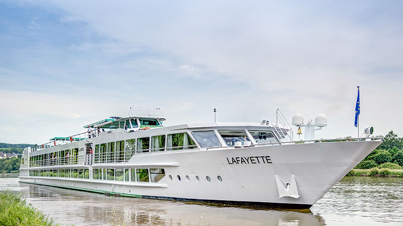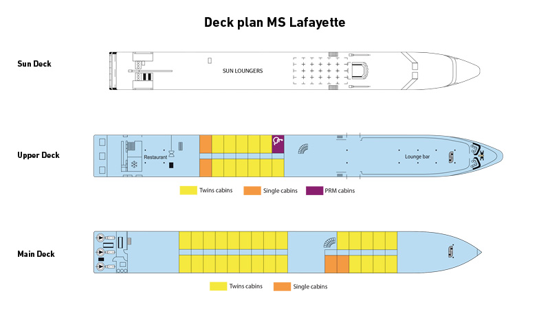Lafayette ble totalrenovert i 2014 og er et lite skip med kun 43 lugarer fordelt på to dekk. Det moderne interiøret er i grå- og sandtoner, kombinert med lilla nyanser. Restauranten ligger på øvre dekk, og byr på utsøkt mat inspirert av det franske kjøkken. På samme dekk ligger salongen med bar og dansegulv. Soldekket er det perfekte stedet å slappe av og beundre landskapet. Her er det komfortable solsenger, stoler og et stort skyggefullt område.