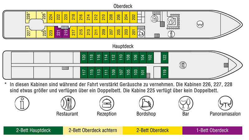 Alle lugarene er utvendige og har bad med dusj, hårtørrer, TV, safe, lite kjøleskap og aircondition. Lugarene er cirka 11 m² og har to separate senger som gjøres om til sofa på dagtid. På øvre dekk kan vinduet i lugaren åpnes.