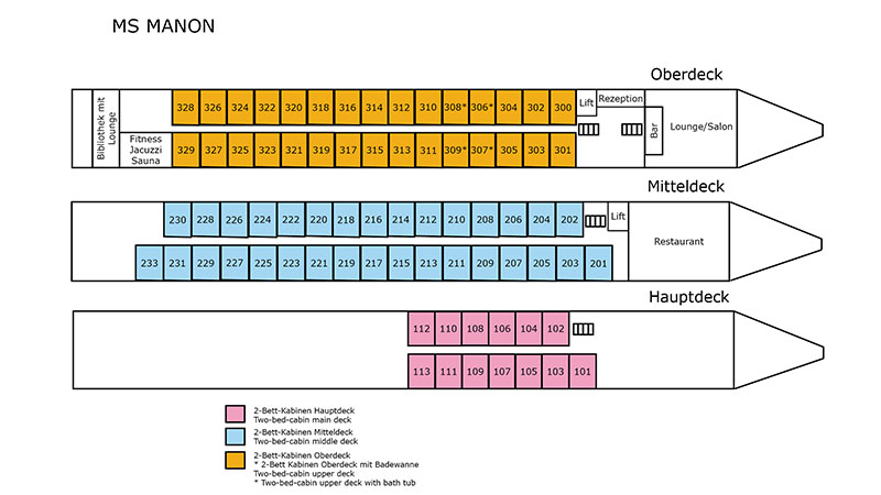 SE-Manon er et komfortabelt skip med hyggelig atmosfære. Om bord er det restaurant, panoramasalong, lite bibliotek og velværeområde med sauna og jacuzzi. Soldekket har, i tillegg til solsenger og stoler, et lite basseng.