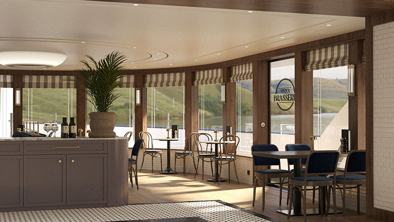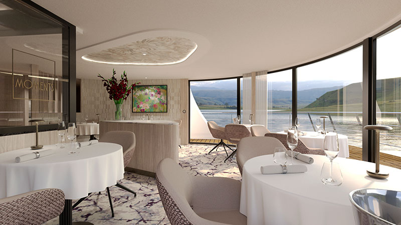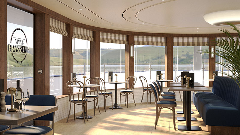 Skipet har tre restauranter: hovedrestauranten Riverside, VIVA Brasserie og Moments. Riverside har fleksible spisetider og åpen bordsetning, mens VIVA Brasserie tilbyr enklere, klassiske retter til lunsj og middag. Moments kun er åpen for middag og serverer mat på Michelin-stjernenivå. Andre fasiliteter om bord omfatter panoramasalong, velværeområde og treningsrom. Soldekket har et lite basseng, solstoler og sittegrupper. Skipet har aircondition i alle fellesarealer og lugarer, samt heis mellom alle dekk (med unntak av soldekket). For de som ønsker å utforske stedene skipet besøker på egen hånd, er det sykler tilgjengelig for utlån.